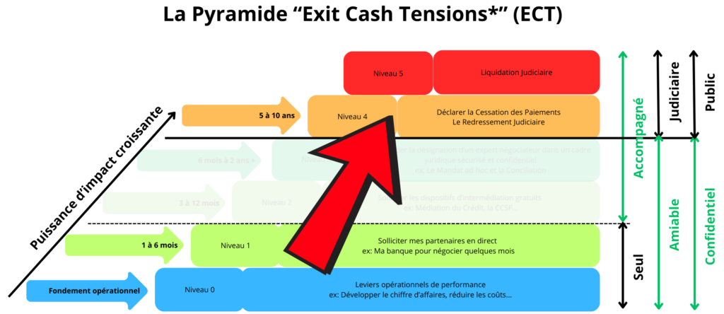 Et ce que le dirigeant ignore très souvent, c’est que cachés entre les actions opérationnelles au niveau 0, et le Redressement Judiciaire en niveau 4, il y a 2 niveaux puissants qui permettent à la fois de gagner du temps, d’augmenter les liquidités disponibles et de sécuriser juridiquement son action.